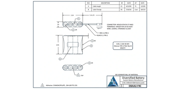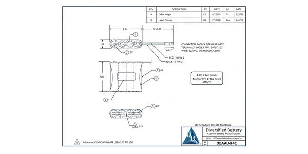As part of our OEM and engineering services Diversified Battery Manufacturing will provide our customers with a technical drawing and bill-of-materials for their project. We also offer this as a separate service if you need a drawing for your battery pack.